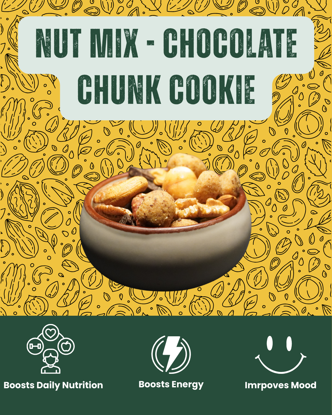 This indulgent blend delivers wholesome nutrition with healthy fats from premium nuts, powerful antioxidants from dark chocolate, whole grains from wheat flour, and sustained energy. It supports heart health, boosts mood, promotes satiety, and satisfies sweet cravings in a more balanced way.